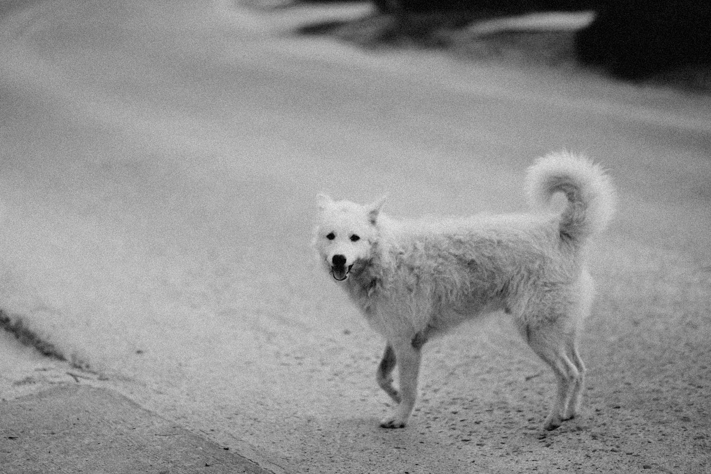 Mara slowed her pace when she heard a high-pitched whimper. A dog tied to a railing in front of a vacant retail space stopped her in her tracks. It’s white fur had been tarnished by the city streets. When the dog made eye contact, it tried to stand from a laying position, but was restricted by the tangled leash. It re-settled and whined pitifully.